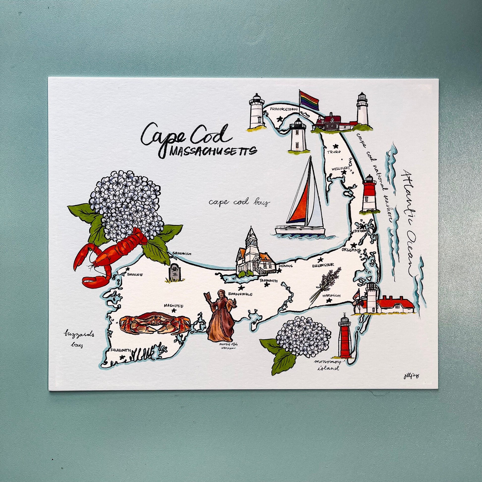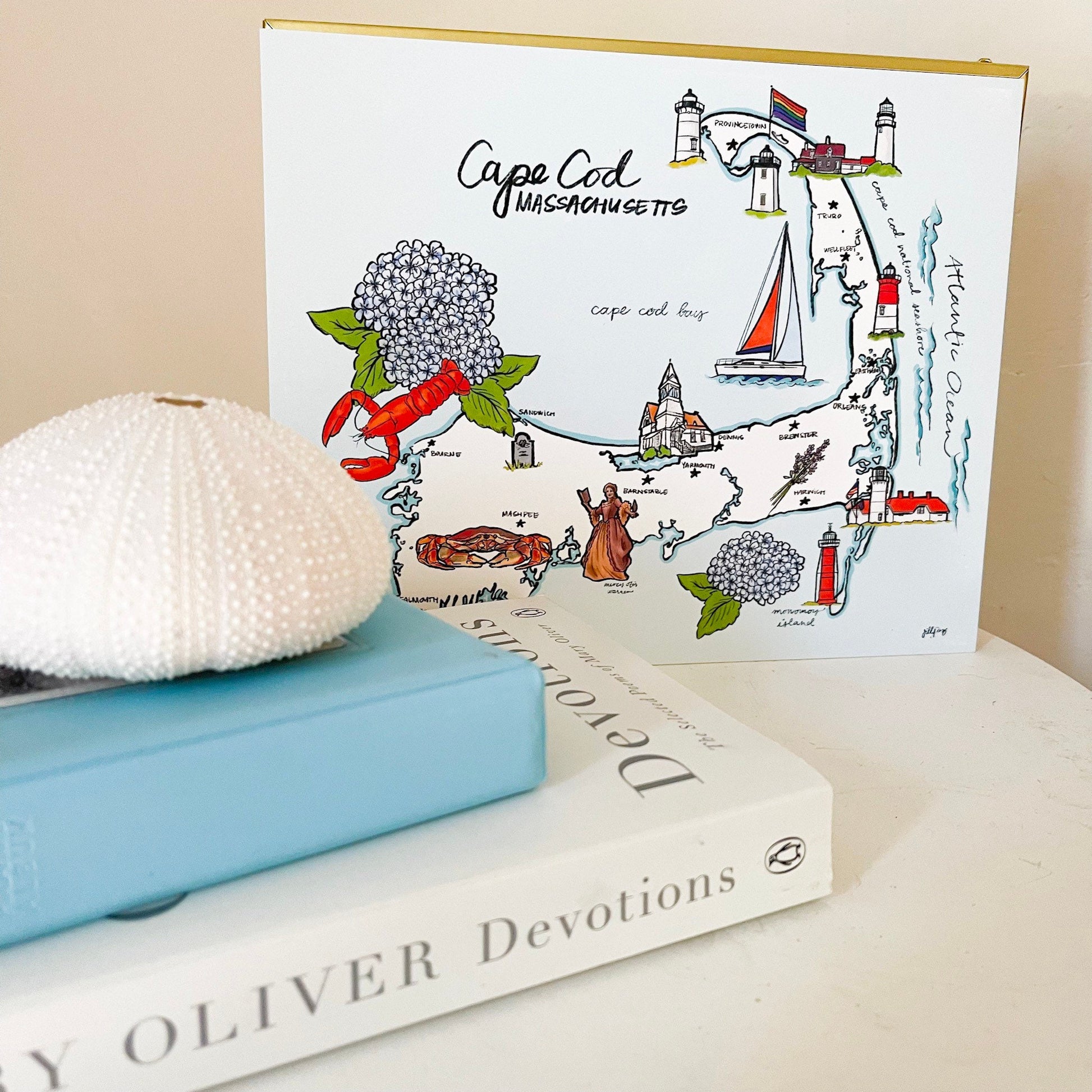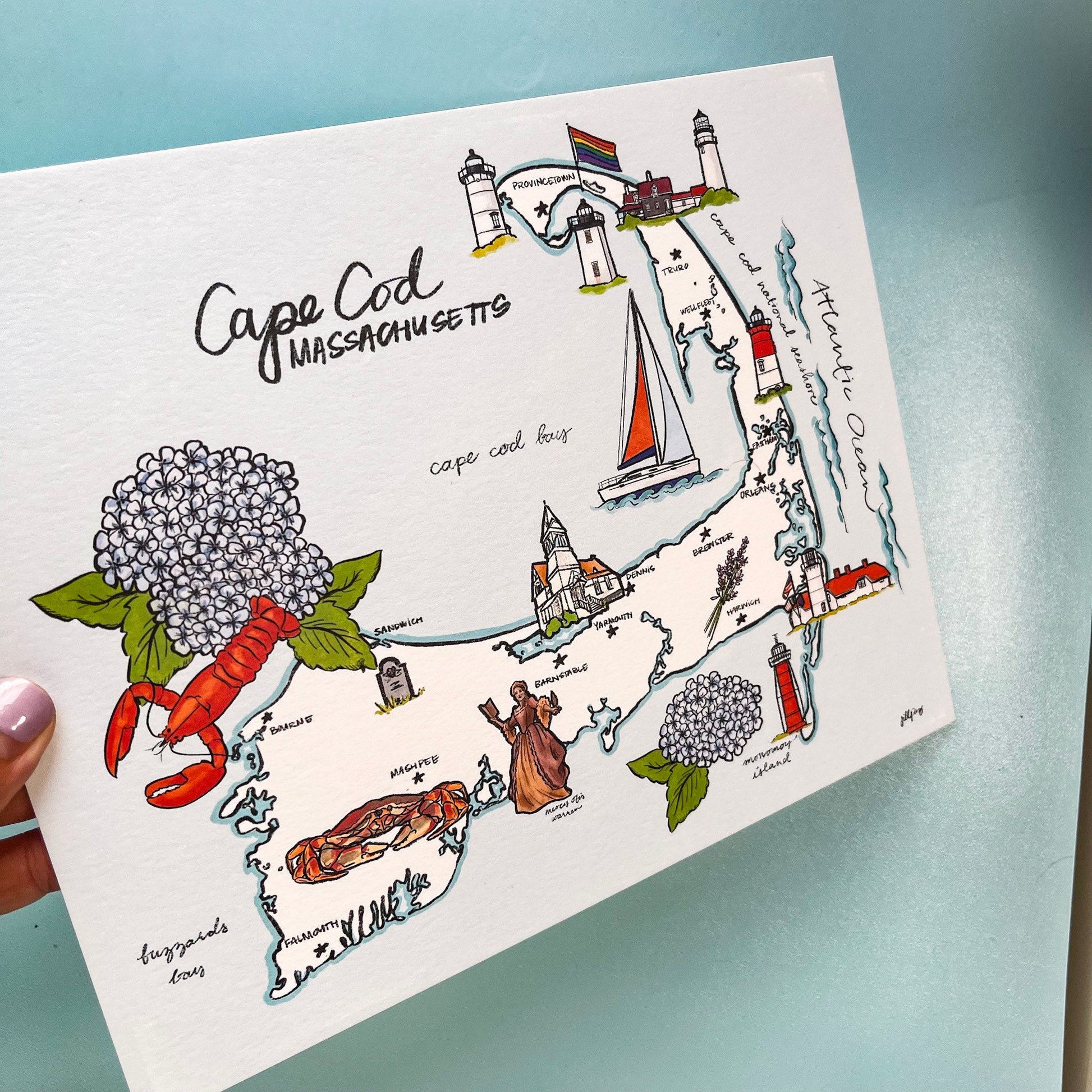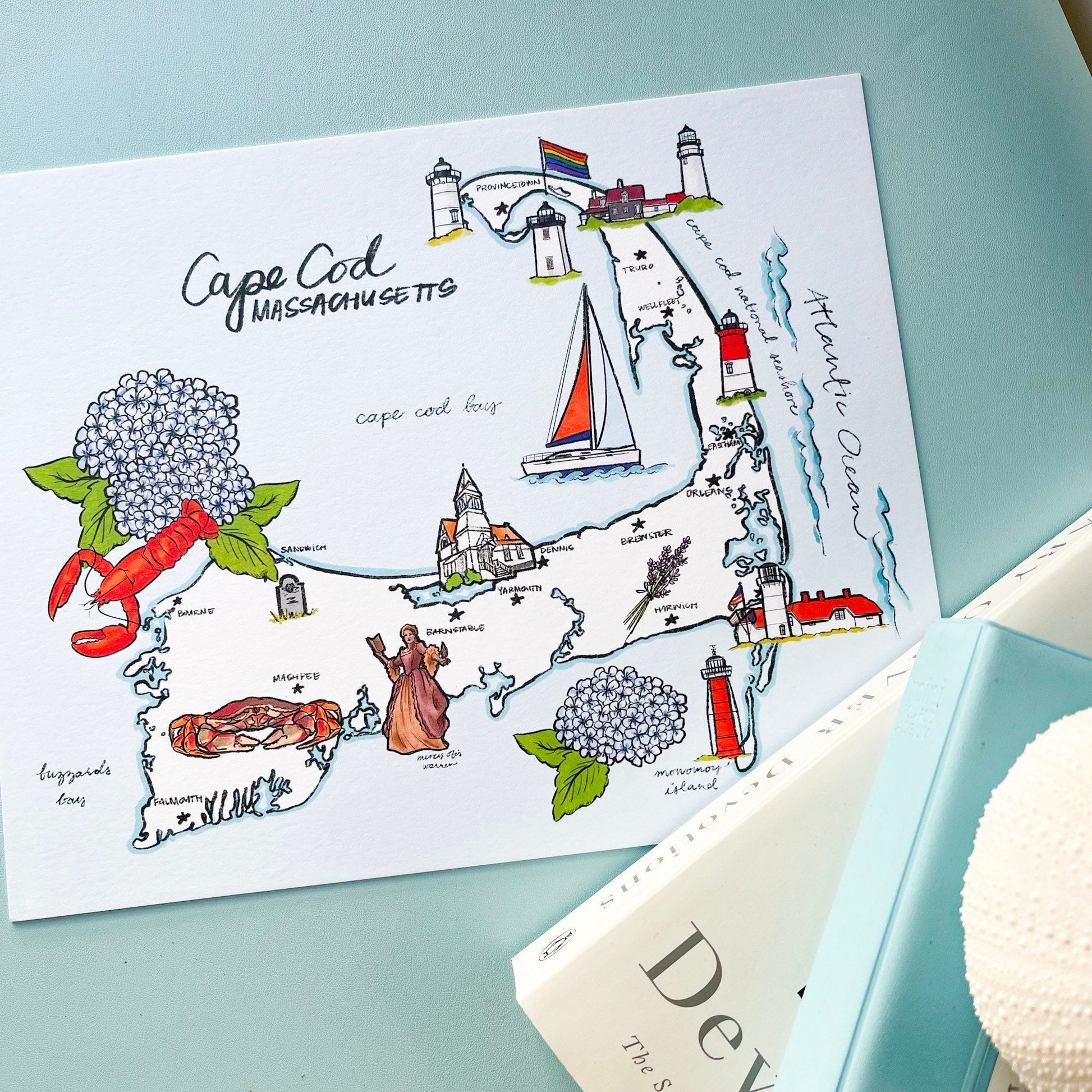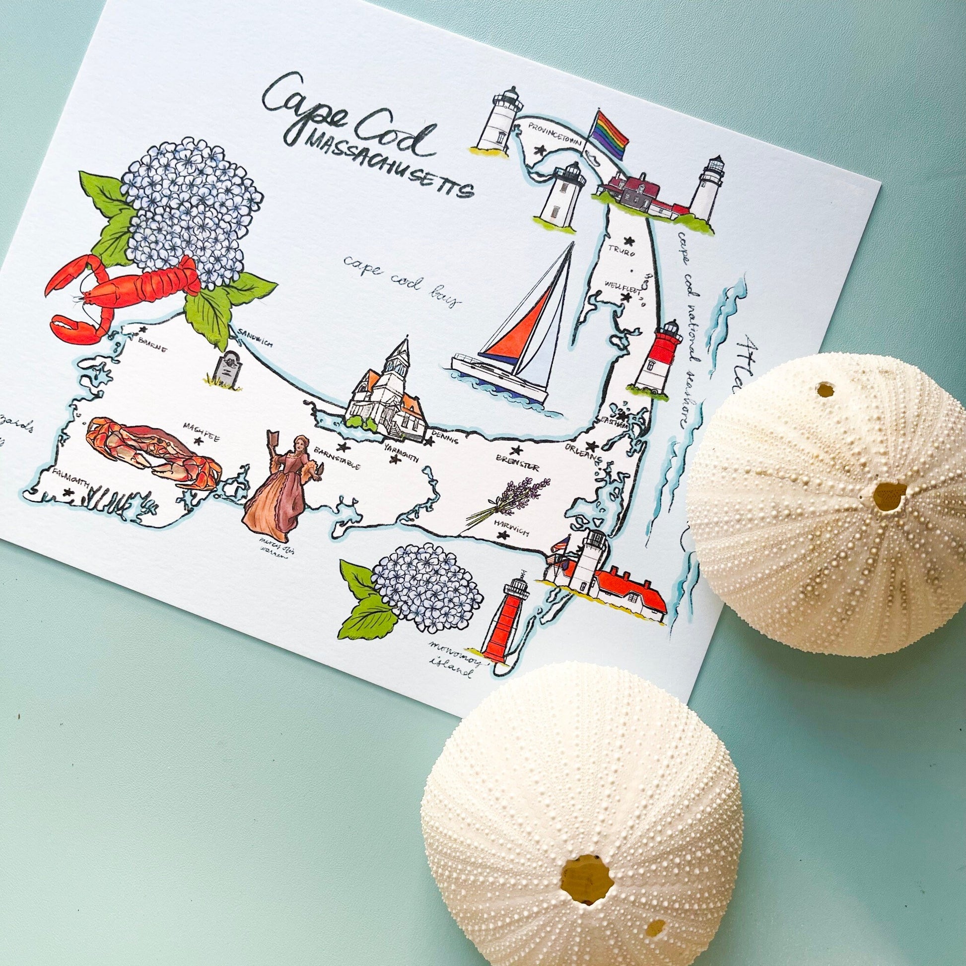 Get ready for a trip to the Cape with our hand-drawn map landmark print! Perfect for New England and Cape Cod lovers, this 8x10 print is printed on double thick matte paper for a premium feel. Proudly made in the USA.