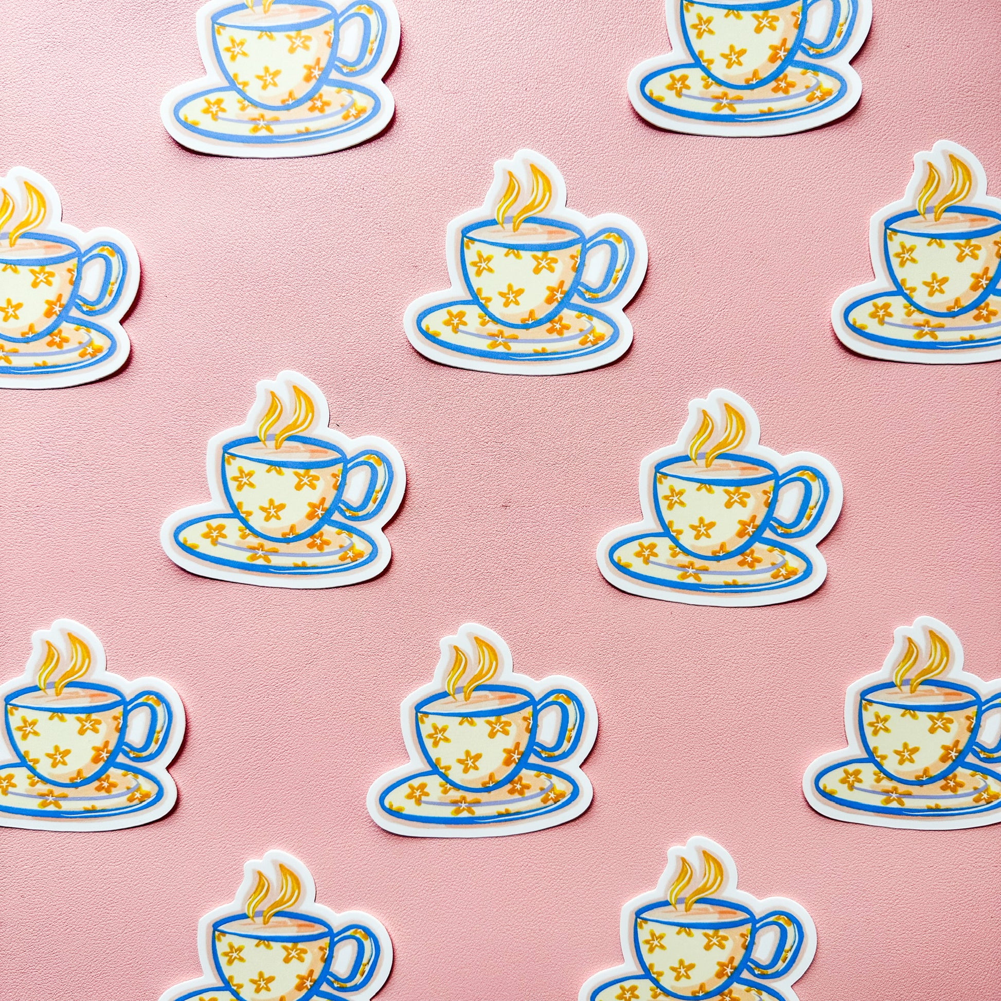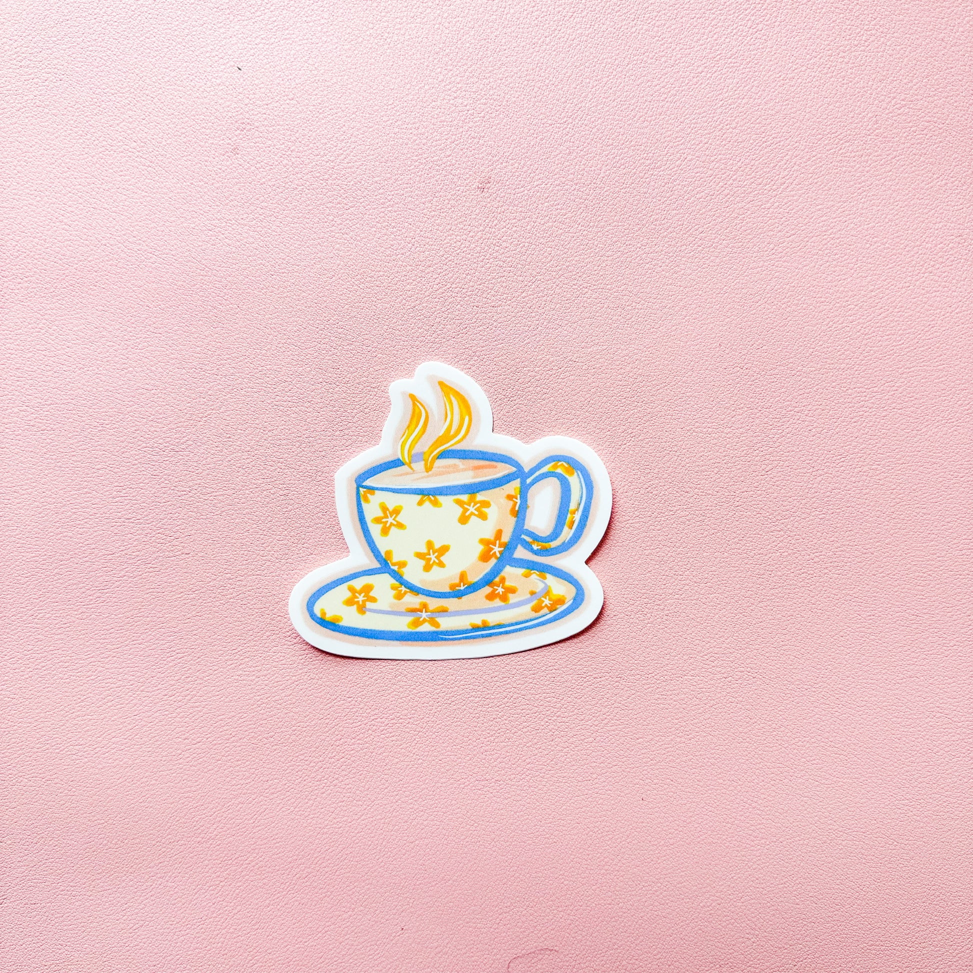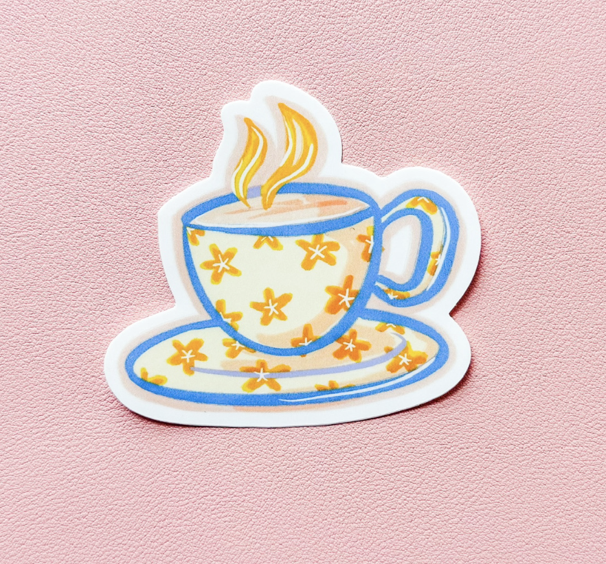Get cozy with our illustrated teacup sticker. This sturdy sticker won't lose its vibrancy or wear away in the sunshine. Ideal for adding a touch of whimsy to your water bottle, laptop, or notebook!