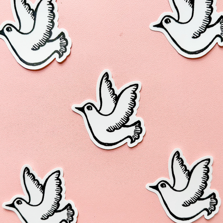 Share peace and spread positive vibes with our Dove sticker! Made from matte, thick and durable vinyl that's protected against scratches, water and sunlight. Reposition it on your favorite water bottle, thermos, laptop or notebook.