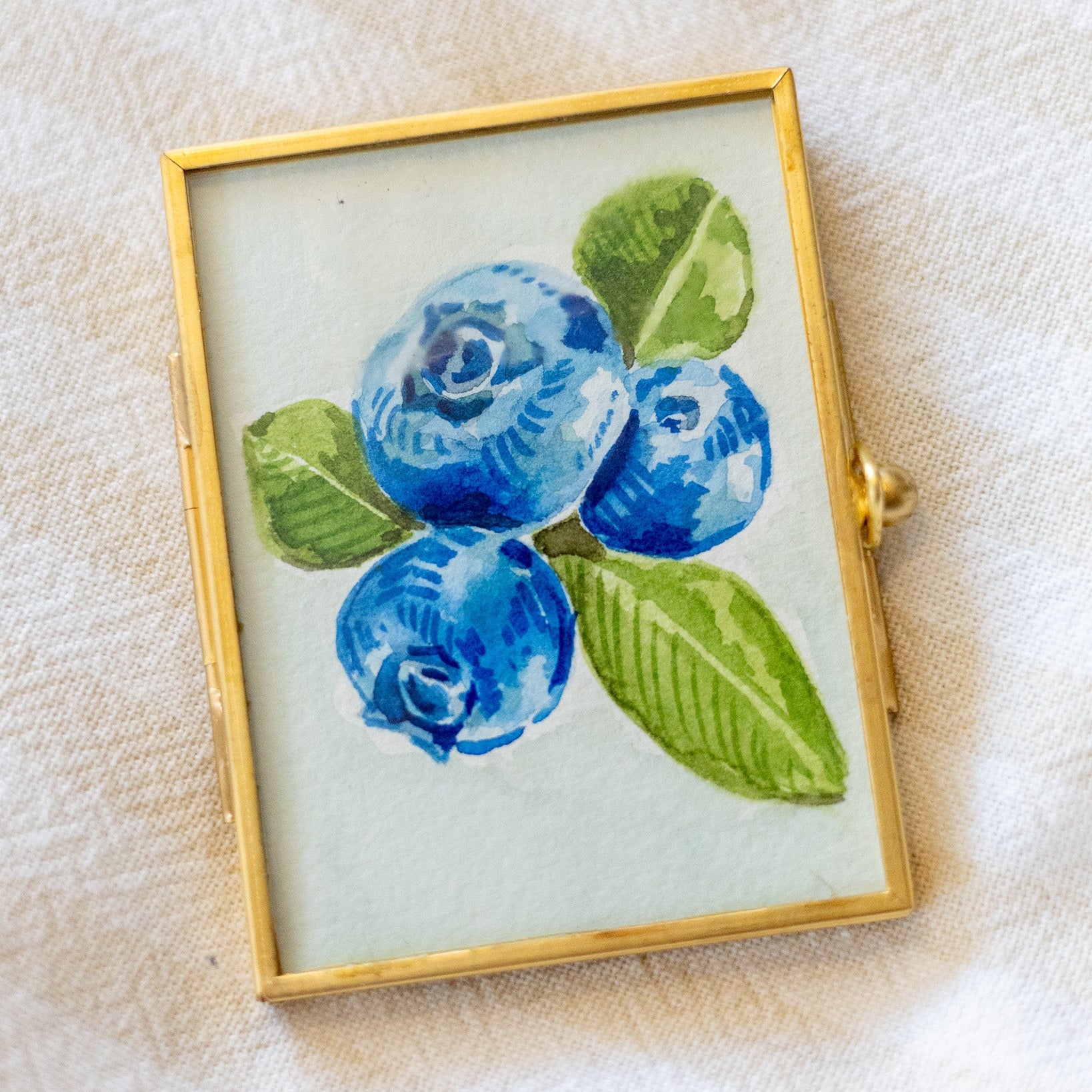 A pocket-sized art piece! This hand-painted blueberry painting comes in an elegant gold frame, complete with protective glass to keep it safe. Perfect for displaying on a shelf, desk, or wall, this original artwork adds charm and nostalgia to any room.